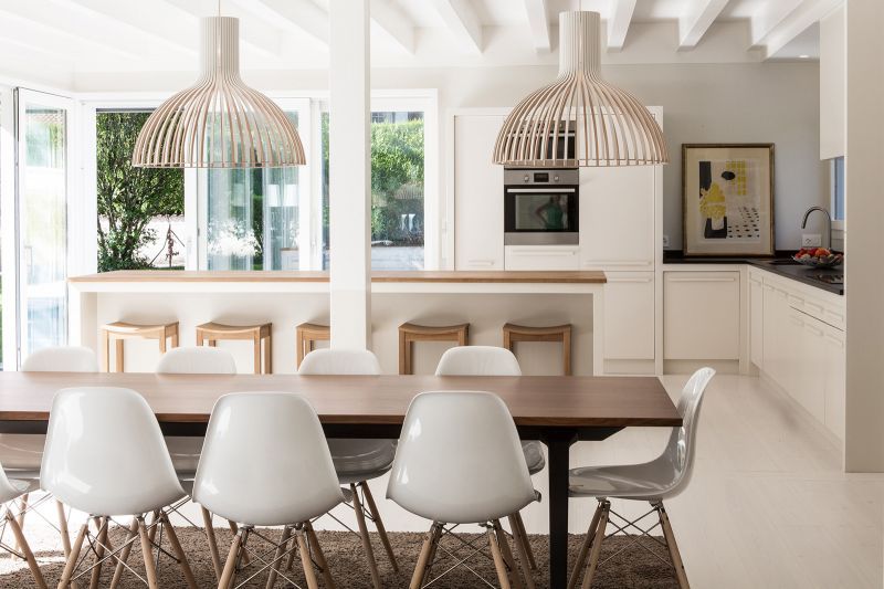 木製のペンダントを窓際のダイニングに